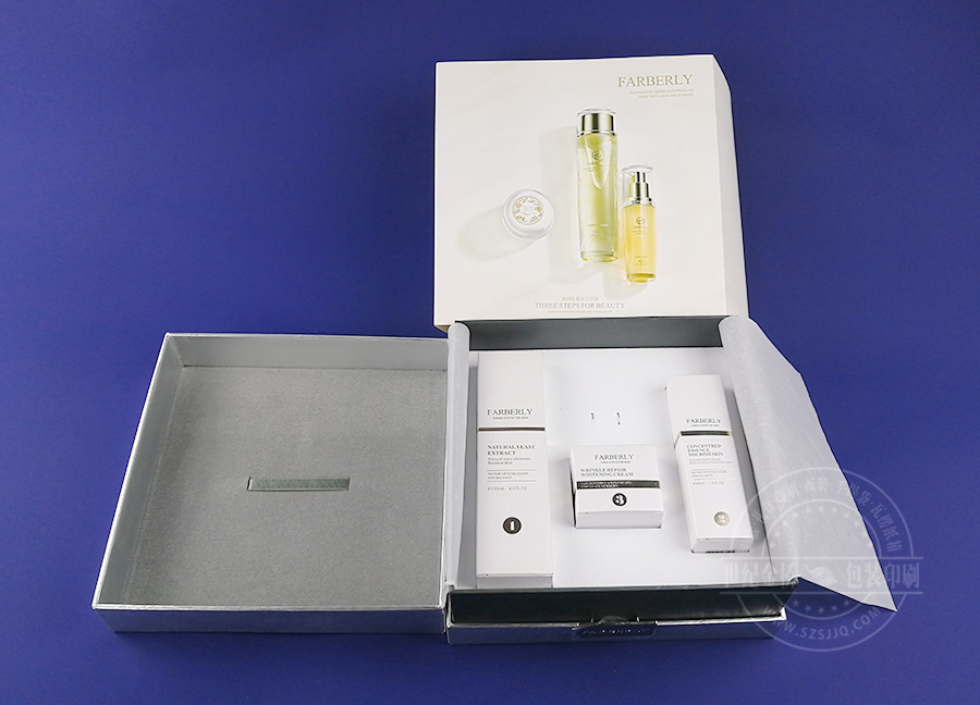 護膚禮盒套裝,此款禮盒分三部分,外套,包裝禮盒,三個內盒,外包裝是銅版紙四色印刷,印金,包裝禮盒內芯為中纖板,外裱特種紙,內盒為卡盒,裝入產品,再放入禮盒,最后套上外套,有很好的儀式感和神秘感,體現出護膚品的尊貴品質。