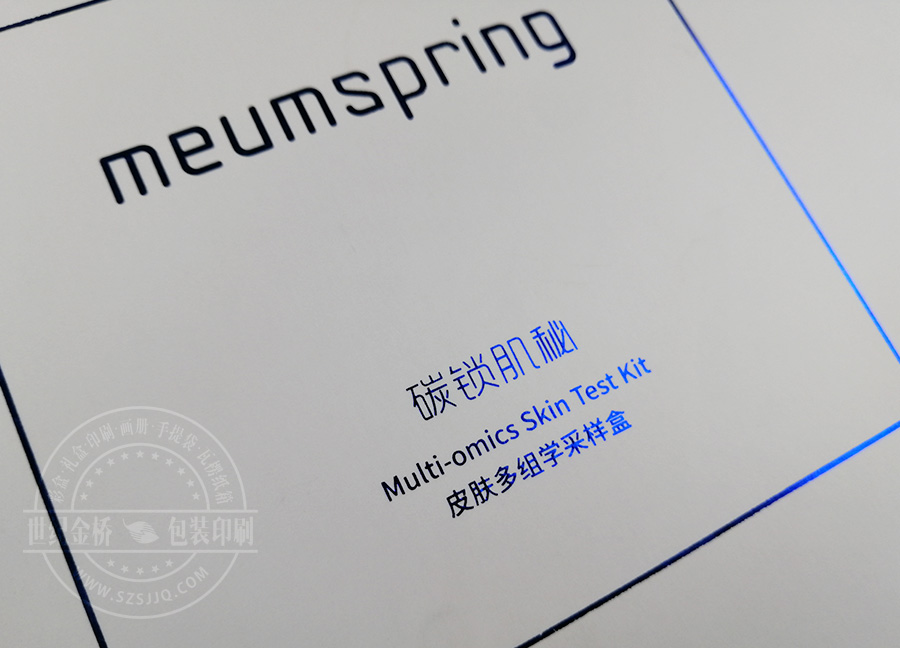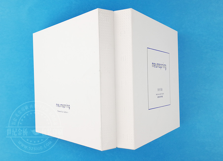 MEUMSPRING護膚禮盒套裝,翻蓋盒的造型開啟更方便,灰卡配雙銅,外燙藍光,神秘效果體現的很好,側面壓印痕,類似書脊效果,科技文化醫療技術合成的護膚包裝盒,讓客戶安心購買使用。